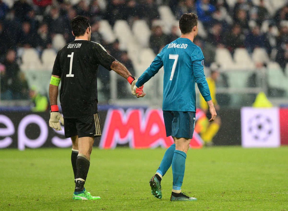 Duas lendas do futebol mundial a demonstrar fair-play no final do encontro entre "Juventus" e "Real Madrid".